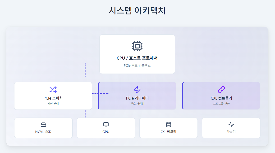 - CXL(Compute Express Link) 컨트롤러: 차세대 인터페이스 기술로, CPU와 GPU, 메모리 등의 자원을 유연하게 공유하고 확장할 수 있도록 돕습니다. AI 모델 학습 및 추론에 필수적인 고대역폭, 저지연 데이터 전송을 가능하게 하는 혁신 기술입니다.